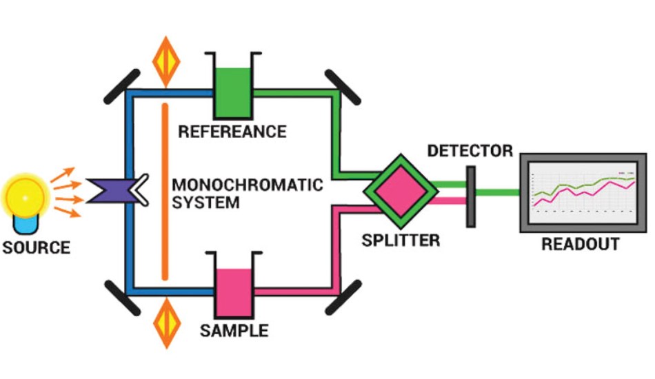 The working of a spectrometer can be explained in a sequence chart. Basically, a light from a source, is allowed to pass through a holder containing the sample and a reference. A molecule/atom/ion in the sample should not be in the reference. Then, the light from both of them is collected and analysed using a grating. The sample would have absorbed segment of light from source and the light from sample would be devoid of that segment. Then, the lights are collected in a Photo-multiplier tube, which amplifies the incoming light signal. This information is then digitized, processed by the computer and the result is a plot of Intensity versus Frequency or Wavelength.