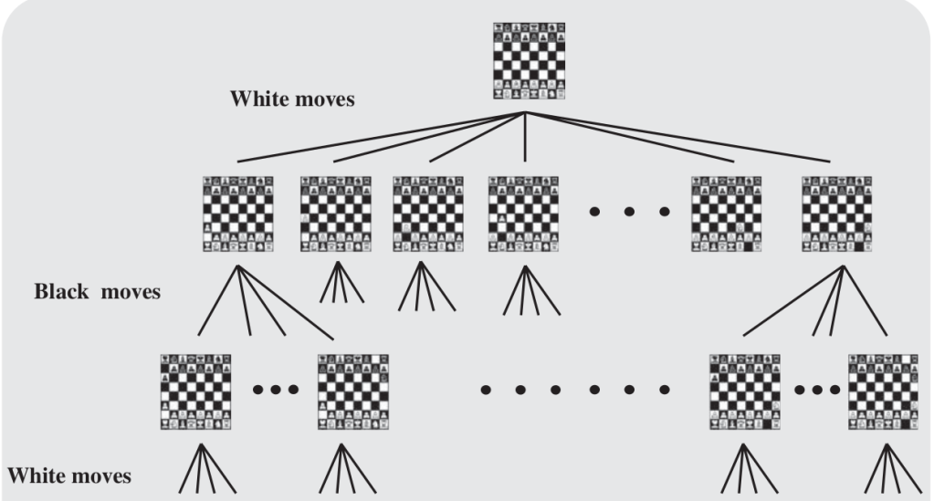 To understand the proof we will need to have some way to represent all possible games that can happen in a chess match. White goes first. How many different opening moves can he make? He can either move a pawn by one or two positions or he can move any one of the knights to either left or right. As there are 8 pawns in total pawns can be moved in 16 ways and two knights that can be moved in 4 ways. Thus there are 20 possibilities for White’s opening move. Now for each of those openings, Black can respond in only finitely many ways. (Never mind how many!) To that White can respond in finitely many ways and so on. We can visualize this using a diagram such as the one given below. It is called a game tree. At the root of this “tree” is the chessboard arranged in the starting position. Below it are all the moves that white can make. Below that are all the moves that black can make in response and so on. Any real-life chess game will follow one path starting at the root vertex all the way to the bottom until there is a checkmate or a stalemate. So it is not difficult to see that our tree will end and not go on forever.