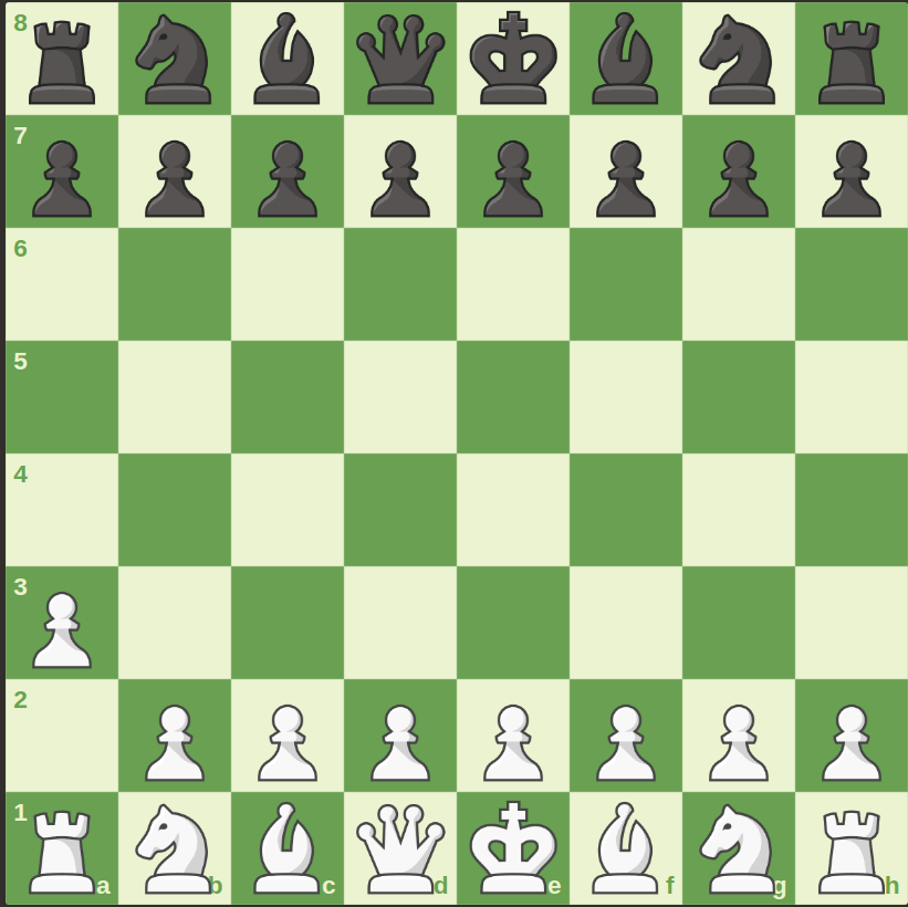 Now we treat each node as a separate game. For instance the the first node in the corresponds to a game in which the starting positions of the pieces is as given below and in this game black goes first. We will call it a subgame.