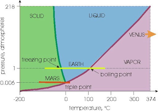Temperature range of Earth (yellow) and Mars (red) on the phase diagram of water. Increasing temperature makes phase of water change along the red line from solid (green) to vapour (purple). Along the yellow line of Earth, water can be seen in all three phases. Source: Centre for Ice and Climate, University of Copenhagen