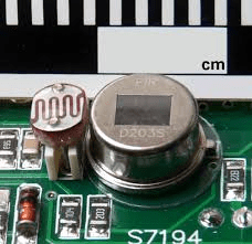 A Pyroelectric Sensor has two rectangular slots made of a material that allows the infrared radiation to reach. Behind these are two separate infrared sensor electrodes, one responsible for creating a positive output and the other, a negative output. The reason for that is that we are looking for a change in IR levels and not ambient IR levels. The two electrodes are wired up so that they cancel each other out. But when a warm body sort of human, or animal enters the region, it first intercepts one half the PIR sensor, which causes a positive differential change between the two halves. When a smooth surface enters the sensing area, the reverse happens, the sensor generates a negative differential change. The corresponding pulse of signals leads to the sensor setting its output pin high.